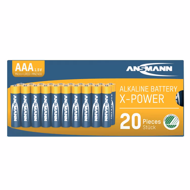 ANSMANN X‑Power Alkaline AAA‑batterier 1,5 V i 20‑pack. Hög prestanda för strömkrävande vardagselektronik.
