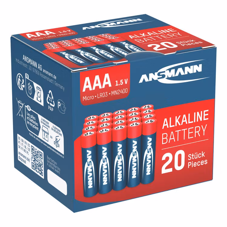 ANSMANN Alkaline AAA‑batterier 1,5 V i 20‑pack. Pålitlig ström för vardagens elektronik och reservbehov.