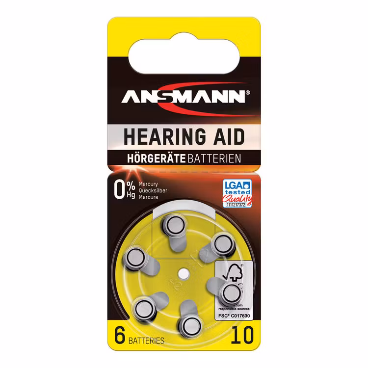 Ansmann hörapparatsbatterier Type 10 / PR70 i 6‑pack. Zinc‑air‑batterier med stabil spänning och lång drifttid för hörapparater.