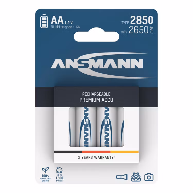 ANSMANN 5035212 är ett laddningsbart NiMH‑batteri i AA‑format (HR6) med mycket hög kapacitet på 2850 mAh (min. 2650 mAh). Batteriet är utvecklat för enheter med högt effekt‑ och strömbehov, där lång drifttid och stabil energileverans är avgörande.