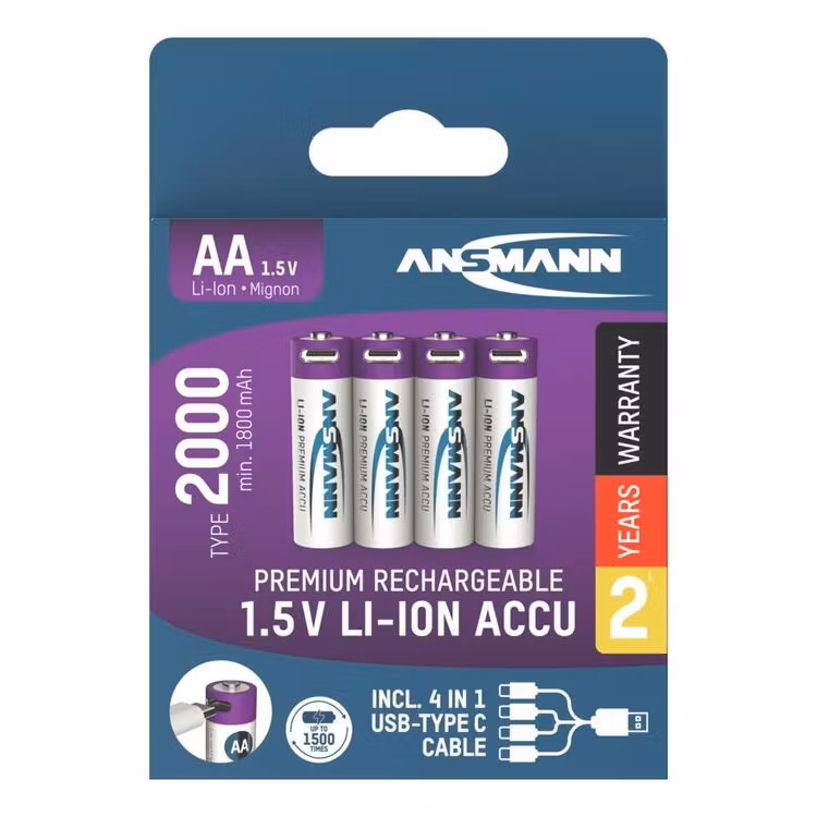 Ansmann AA Li‑ion‑batteriet har mycket låg självurladdning, hög energieffektivitet och ett utmärkt pris‑prestandaförhållande. Produkten levereras som 4‑pack tillsammans med en 4‑i‑1 USB‑C‑laddningskabel, vilket gör laddningen enkel och flexibel.